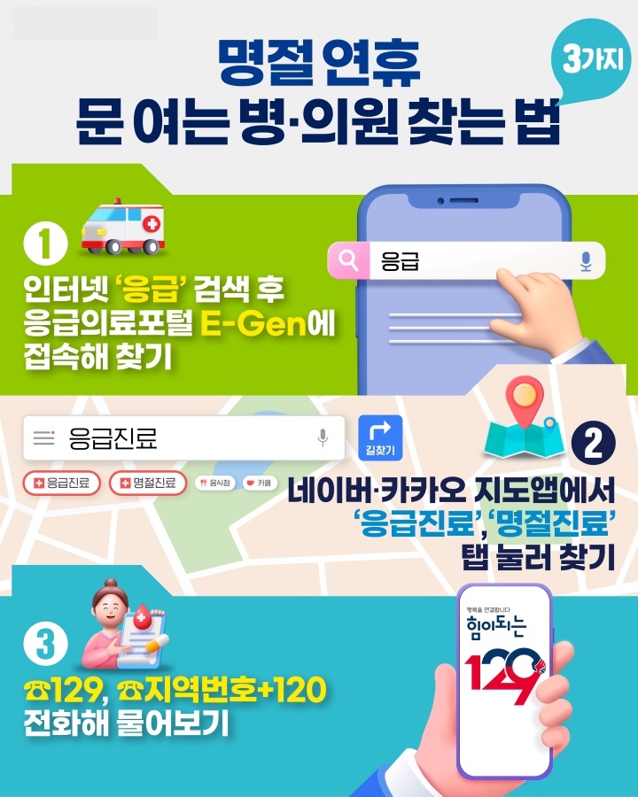 설 연휴 동안 예상치 못한 건강 문제가 발생할 경우, 응급의료포털(e-gen)과 보건복지부 콜센터(129), 시도 콜센터(120)를 통해 문 여는 병·의원과 약국 정보를 쉽게 확인할 수 있습니다. 또한, 네이버지도와 카카오맵에서도 명절 진료 의료기관 정보를 제공하므로 이를 적극 활용하시기 바랍니다.